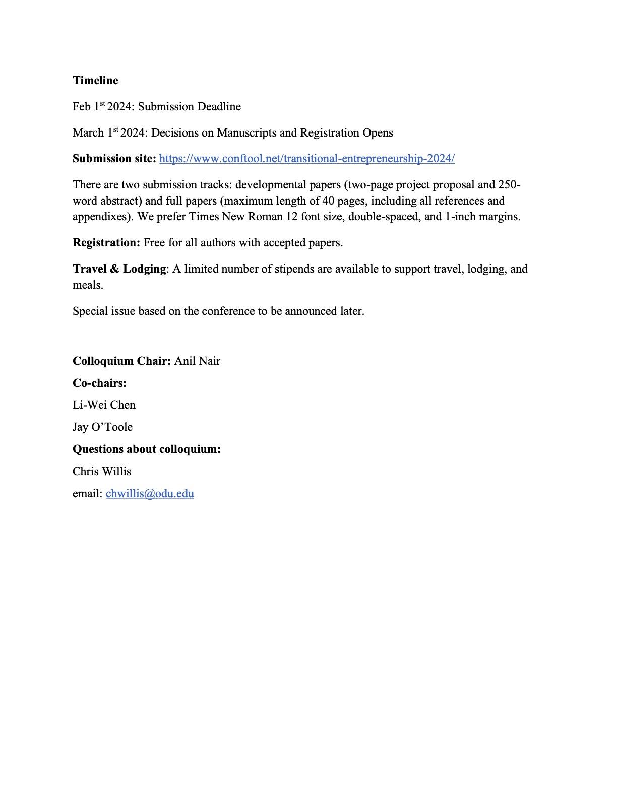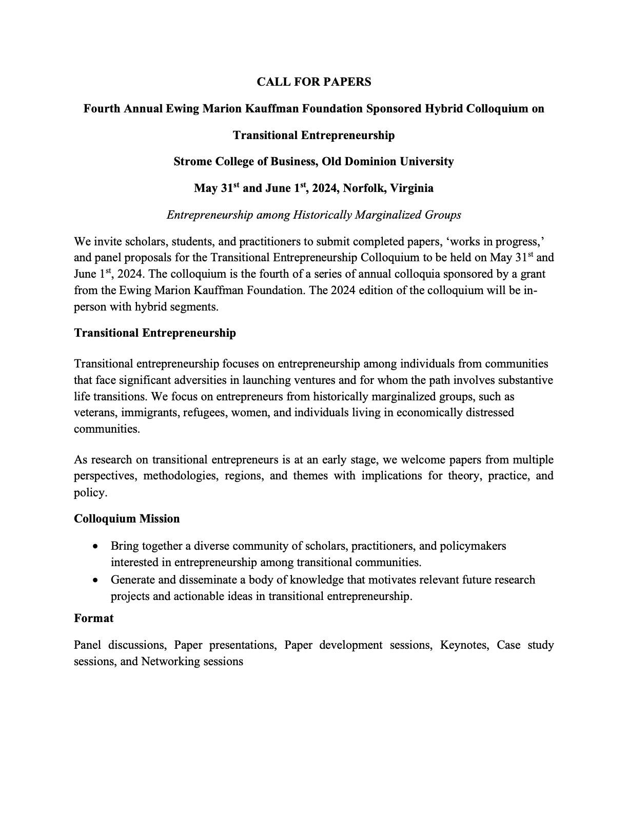 Fourth Annual Ewing Marion Kauffman Foundation Sponsored Hybrid Colloquium on Transitional Entrepreneurship