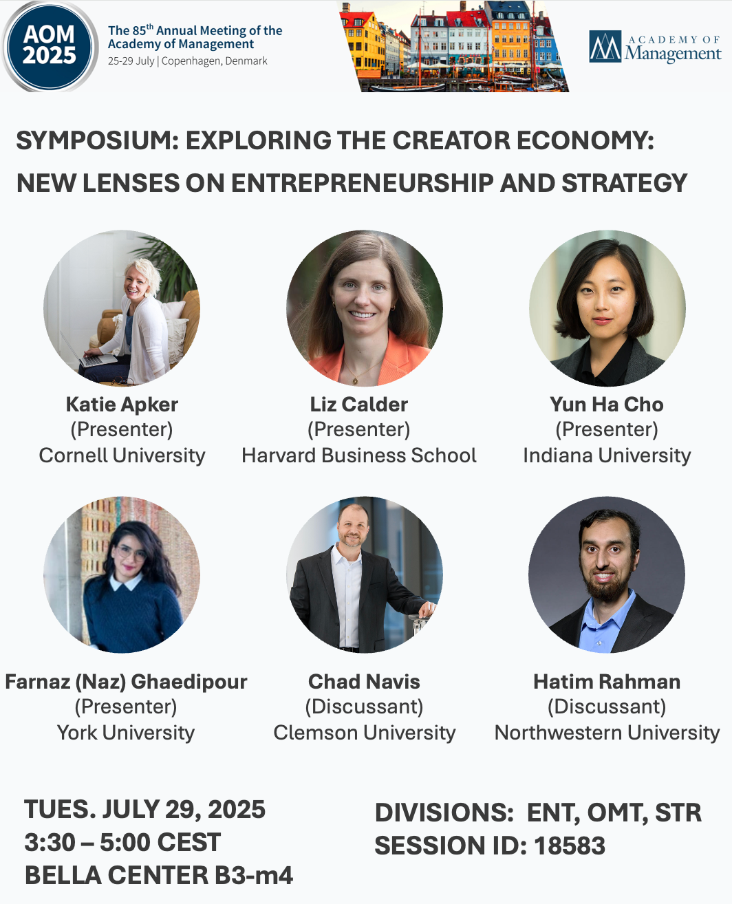 Interested in the Creator Economy and how these new forms of work are shifting our understanding of strategy & entrepreneurship? Join us Tuesday afternoon for a presenter Symposium: 18583: Exploring the Creator Economy: New Lenses on Entrepreneurship and Strategy. LINK for more info