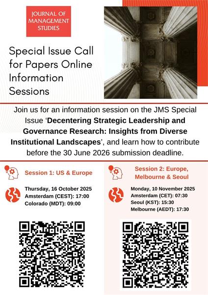 Journal of Management Studies is hosting two virtual information sessions on the Special Issue "Decentering Strategic Leadership and Governance Research: Insights from Diverse Institutional Landscapes" (Submission Deadline: 30 June 2026).