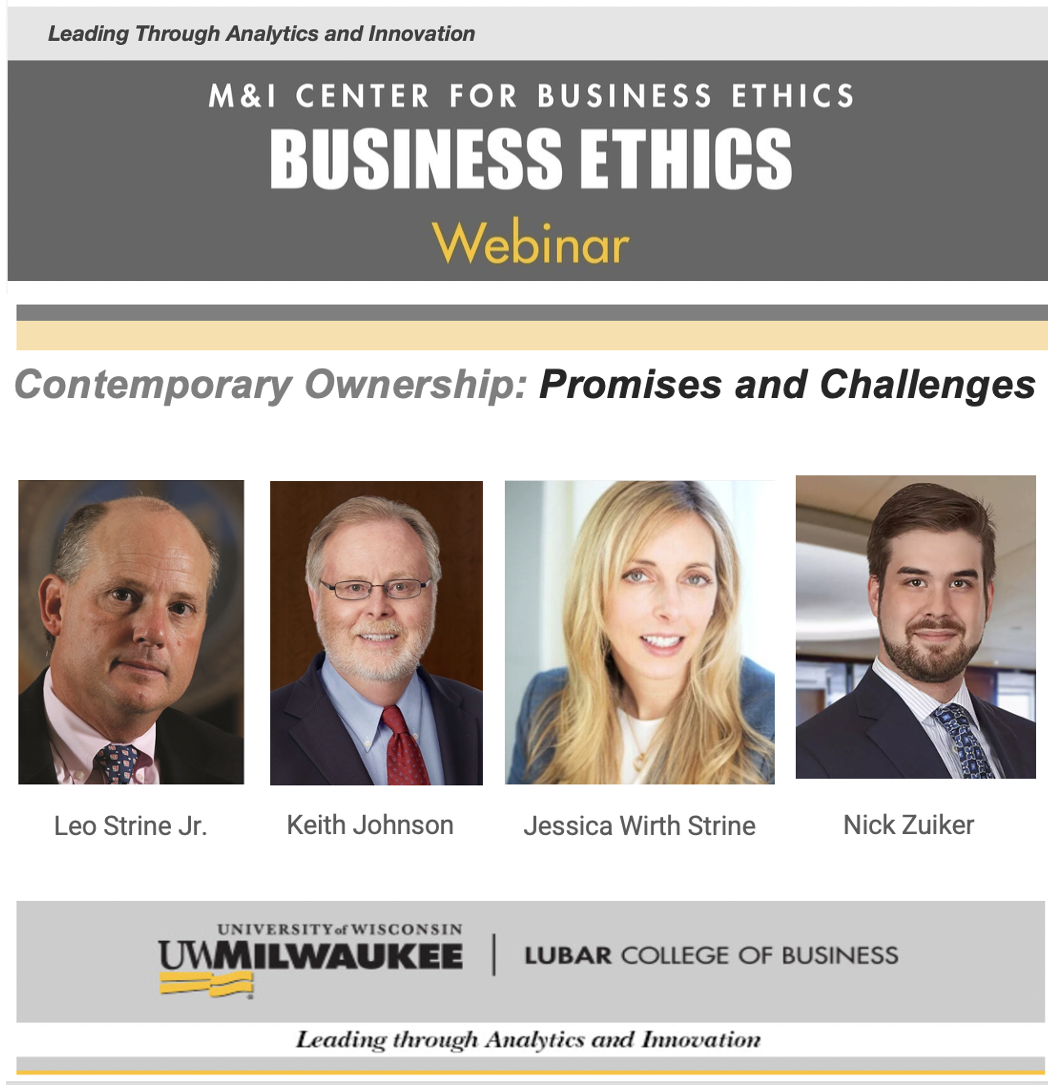 Former Chancellor of Delaware Court of Chancery - Judge Leo Strine Jr., Keith Johnson (Global Investor Collaboration Services), Jessica Wirth Strine (Jasper Street), and Nick Zuiker (Reinhart's Institutional Investor Services) will share their insights on Contemporary Ownership: Promises and Challenges in November 7th webinar organized by the M&I Center for Business Ethics, Lubar College of Business (Nov 7th: 11-noon EST); registration: https://uwm.edu/business/forms/rsvp-contemporary-ownership-promises-and-challenges-webinar/